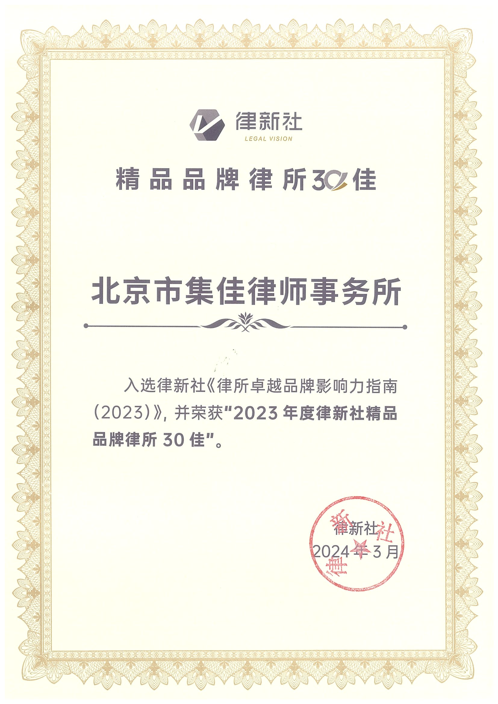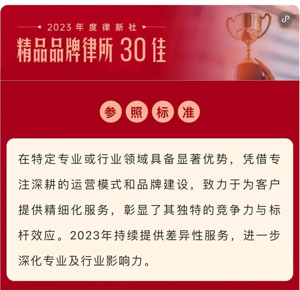 2024年3月2日,由中国法学交流基金会指导、律新社主办的“致·追光者”第二届法律服务业品牌发展论坛暨律新社2023年度品牌盛典隆重举行,现场发布了备受关注的《律所卓越品牌影响力指南(2023)》,乐球直播凭借在知识产权领域的卓越实力和良好口碑,荣登“2023年度律新社精品品牌律所30佳”榜单。
