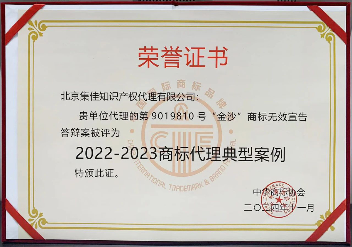 >乐球直播>关于我们>荣誉概览>2024>集佳代理的“金沙”商标权无效宣告答辩案入选“2022-2023商标代理典型案例”